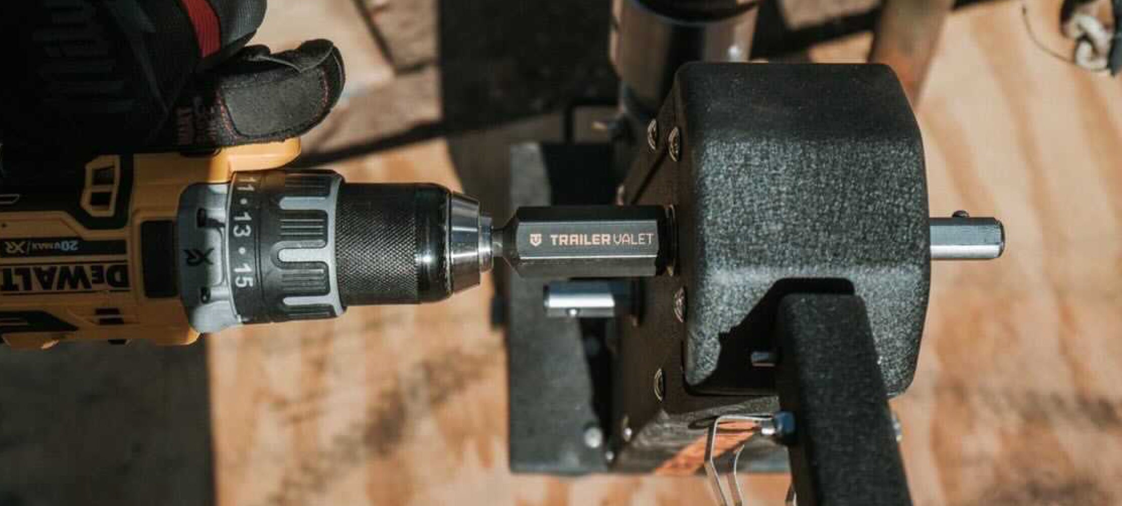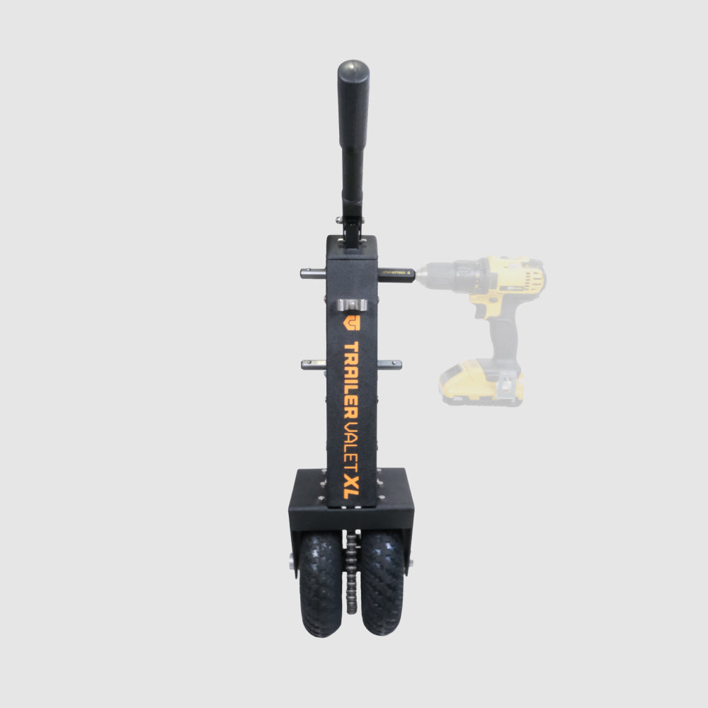 The XL attaches to your trailer via the coupler or bracket and works as a hand dolly or drill-powered mover, using low or high gear with a 20–24V cordless drill.